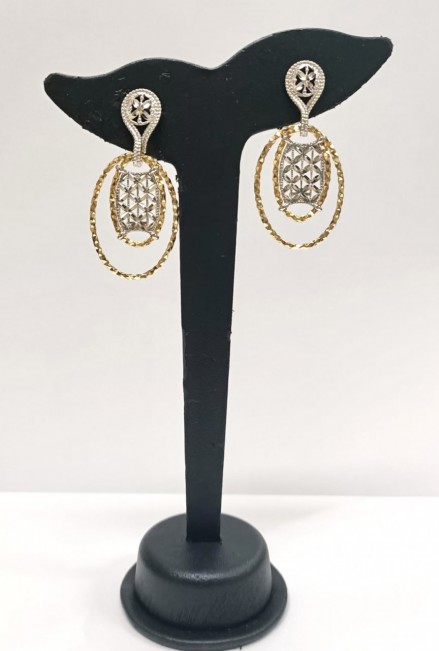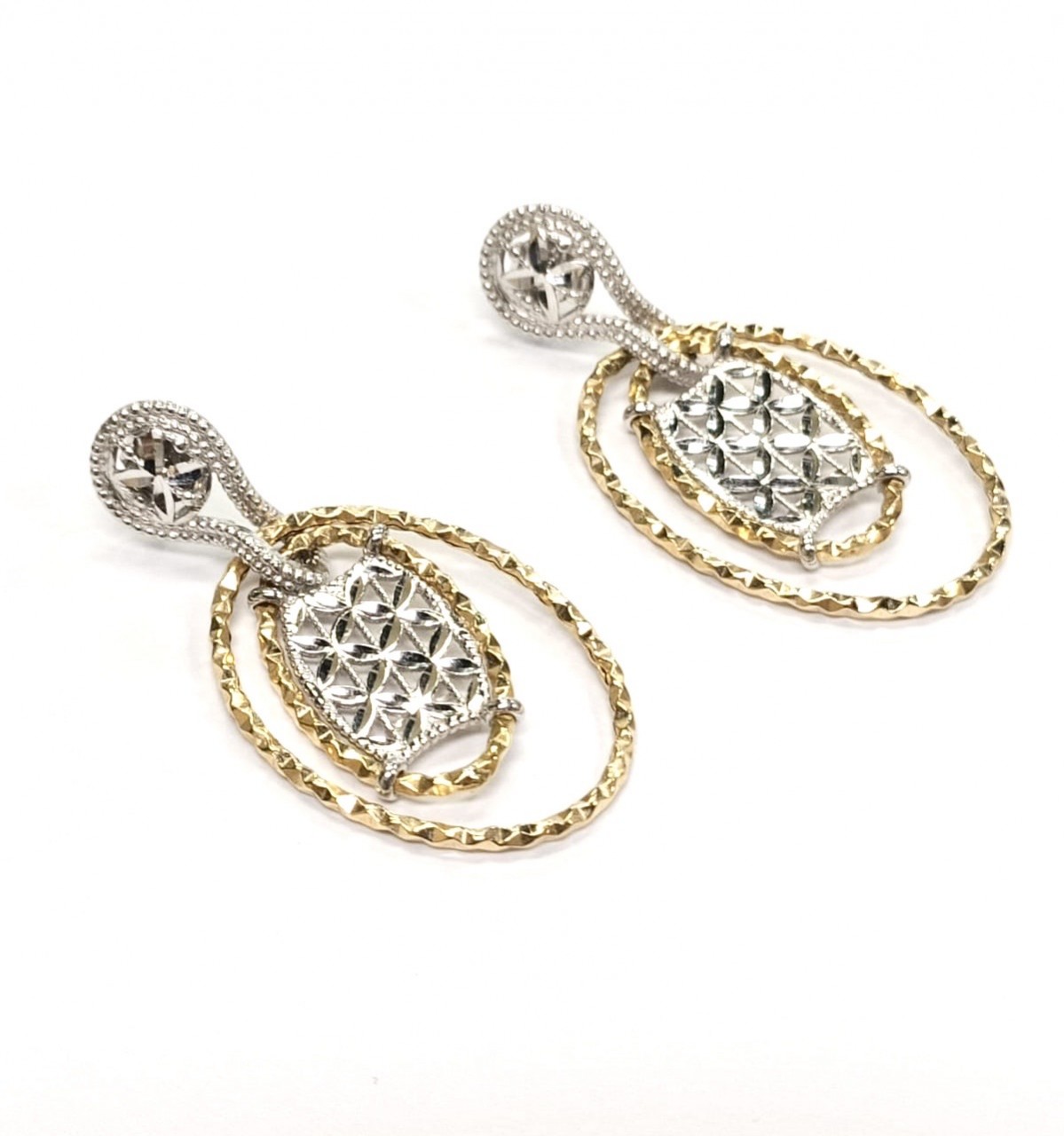 KE04 - LORENZO UNGARI - ORECCHINI PENDENTI A DOPPIA GOCCIA IN ORO GIALLO E BIANCO 18K CON MAGLIA A FINITURA ARTIGIANALE IN TESSITURA PICCHETTATA